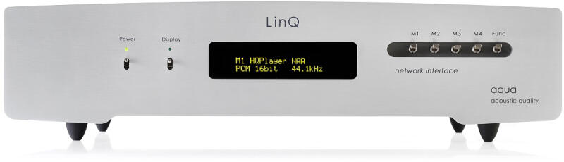 OurNetwork InterfaceThe new LinQ was created following a precise idea. Fast and standard technical solutions do not belong to the aqua philosophy. aqua has developed an extremely streamlined long-life platform and network bridge modules focused on audio playback functions. We prefer to use know-how developed in-house, for a number of reasons in respect the aqua SQ standards. This has required a considerable effort in terms of time and resources, but the result is immediately evident on first use. LinQ is a highly modular device, based on a series of completely independent units. Each module performs a particular function, for which it is optimized. Each module has its own dedicated power supply and plugs into a connector on the base platform of the device. In addition to the optimization of the particular function, this architecture guarantees an exceptional possibility of future upgrades. The communication lines of each module with the network are galvanically isolated. Note that further isolation is guaranteed by the fact that one of the modules is a LAN switch, developed internally by aqua. This is an important point: in fact, during the listening tests, and also in the laboratory ones, we obtained the best results with the use of this architecture with a built-in LAN switch. Always having the sound result as an objective, LinQ does not use a USB interface: the output is on AQlink, the aqua I2S proprietary connection. In this way thepassageon USB is skipped, avoid any losses in sound quality. Furthermore, proprietary circuits have been developed in the output FPGA, in order to implement the S PDIF, AES EBU and Dual-AES outputs. NO-COMPROMISE AUDIO ENGINEHQPlayer Core + NAA (cascade-modules). The breakthrough. LinQ knows no obsolescence. Our focus was to create an Audio Engine for Roon with zero-setup. The ambitious vision to combine extreme Sound Quality with delight. The Core exploits the new i. MX8 micro (ARM 64bit), with its incredible performance, low latency, and revolutionary power efficiency. And a customized lightweight kernel (UNIX-based). Roon can be configured to implement of HQPlayer into a Zone. HQPlayer owns the final connection to the Audio Engine, and Roon is just passing along a stream of bits from media filesStreaming services as Qobuz and Tidal. This allows you to enjoy the benefits of HQPlayer SQ and the library management capabilities of Roon at the same time. The Core is zero-configuration (Plug and Play). The license key of HQPlayer Embedded is pre-installed in our labs and the LinQ is ready to use. The HQPlayer-based LinQ Core remains true to the philosophy of aqua brand, it is not aimed at digital signal processing. FEATURESProprietary fully floating hybrid 2-stage Network + FPGA module with proprietary code4 Slots to implement future-proof network protocols (modules). Available now:- HQPlayer Core + NAA (cascade-modules)No-Compromise Audio Engine for Roon- HQPlayer NAARenderer- UPnP DLNARendererIn RD:- SqueezeliteRendererComing soonFull optimization of the UNIX code to run just the processes necessary for HQPlayer Embedded such as Audio Engine for RoonInternal custom developed LAN switch (isolated)Pure Bit-perfect FPGA signal processingUncompromising digital interface AQlink PRO (I2S protocol)Galvanically isolated output stage (upgradable)2 separate low noise C-Core power transformers for network circuitry and digital decodingMODULAR DESIGN with upgradeable multi board platformQobuz, Tidal and other main streaming services supportedZero setup, direct access to the Network Module by key and IR5 remoteHigh-quality partsInput:- ETHERNET networkn. 1 standard RJ-45 connector LAN No network configuration is required (DHCP system)Outputs:- AQlink I2Sn. 1 Ethercon RJ-45 connector (PCM 32 bit 384kHzDSD128 max)- Dual-AES EBU (IEC 60958)n. 2 XLR 110 ohm connectors (PCM 24 bit 384kHzDSD128 max)- AES EBU (IEC 60958-4)n. 1 XLR 110 ohm connector (PCM 24 bit 192kHzDSD64 max)- S PDIF (IEC 60958-1)n. 1 BNC 75 ohm connector (PCM 24 bit 192kHzDSD64 max)- S PDIF (IEC 60958-3)n. 1 RCA connector (PCM 24 bit 192kHzDSD64 max)OLED display with user off-selectable illuminationRC5 IR remote controller (optional)Aluminium anti-resonant cabinet with NextelDesigned and handmade in Italy